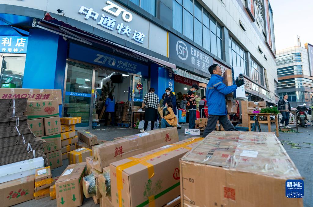 1月31日,一名快遞工作人員在昆明斗南花市搬運打包的鮮花。