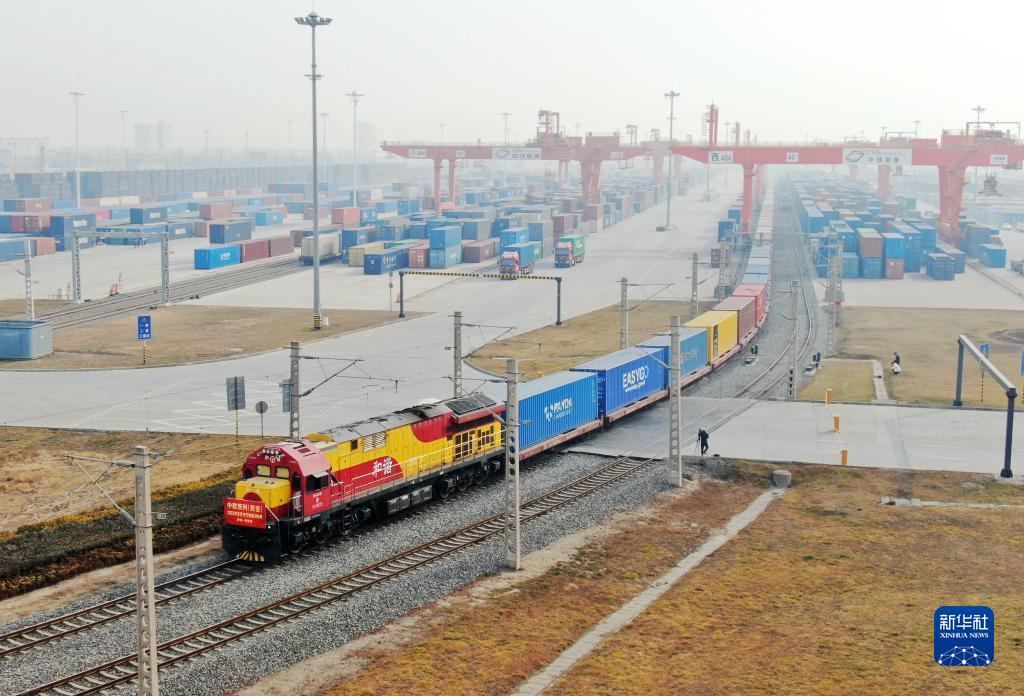 2月1日,X8151次中歐班列從西安國際港站駛出開(kāi)往明斯克(無(wú)人機照片)。