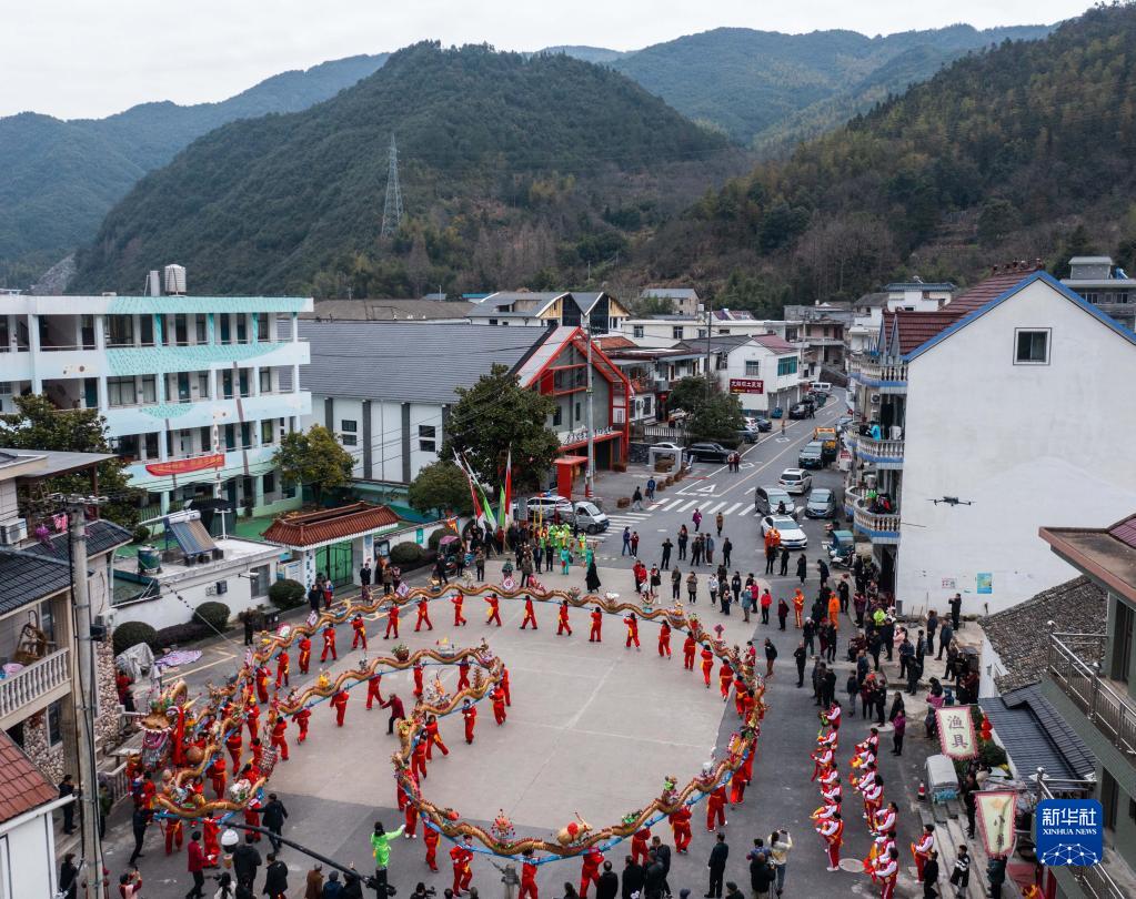 當日是農歷正月十一,在梅花鑼鼓的伴奏下,浙江省杭州市富陽(yáng)區湖源鄉窈口村女子板龍隊舉起由50余張板凳連起來(lái)的百米板龍舞動(dòng)起來(lái),拉開(kāi)了湖源鄉新春系列迎元宵活動(dòng)的序幕。