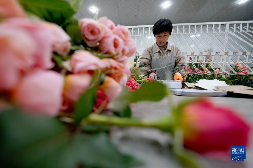 2月1日,村民在河北邱縣盛水灣玫瑰產(chǎn)業(yè)園包裝玫瑰花。