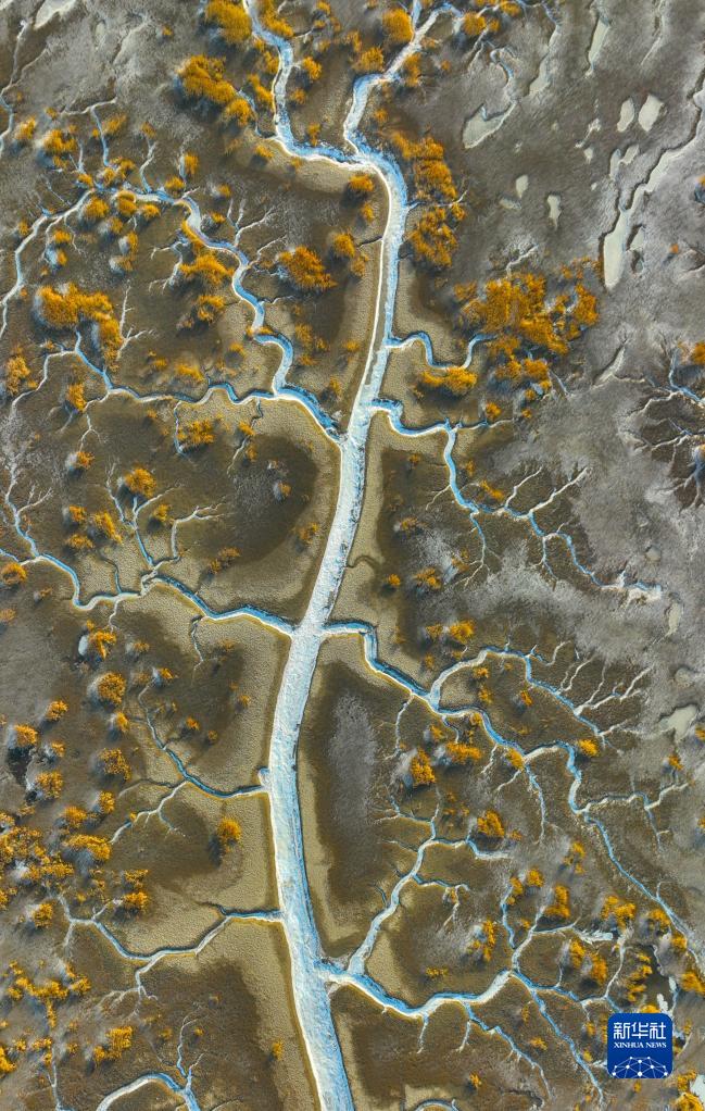 近日,在遼寧盤(pán)錦遼河口濕地,海水在潮汐作用下涌入遼河口濕地的潮溝,并凝結成冰,從高空看去,宛若蜿蜒曲折、形態(tài)各異的“冰脈”。