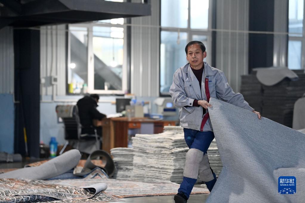 在天津市武清區崔黃口鎮凱利地毯有限公司,工人搬運地毯(2月1日攝)。
