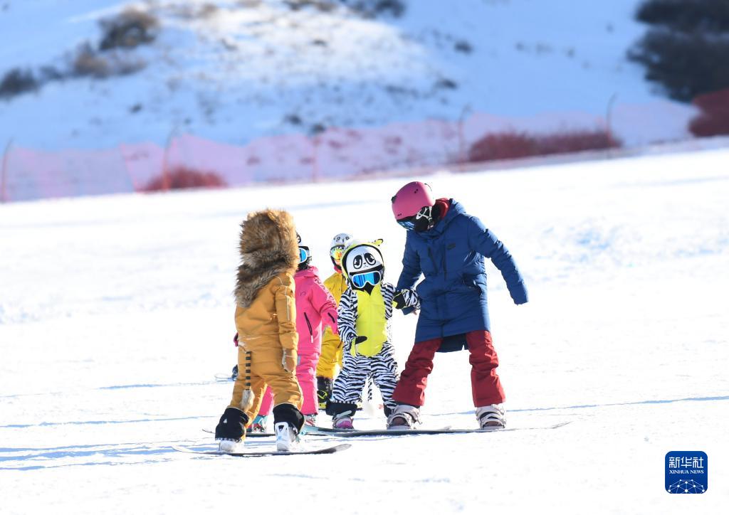 在新疆白云國際滑雪場(chǎng),許秀娟(右一)在為前來(lái)參加免費公開(kāi)課的小學(xué)員們講解單板滑雪技巧(2021年12月21日攝)。
