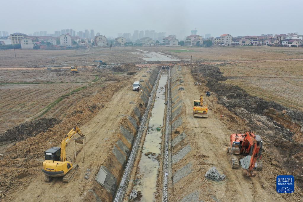 2月2日,工人在湖南省益陽(yáng)市赫山區龍光橋街道五龍壩村高標準農田建設現場(chǎng)修建排水渠(無(wú)人機照片)。