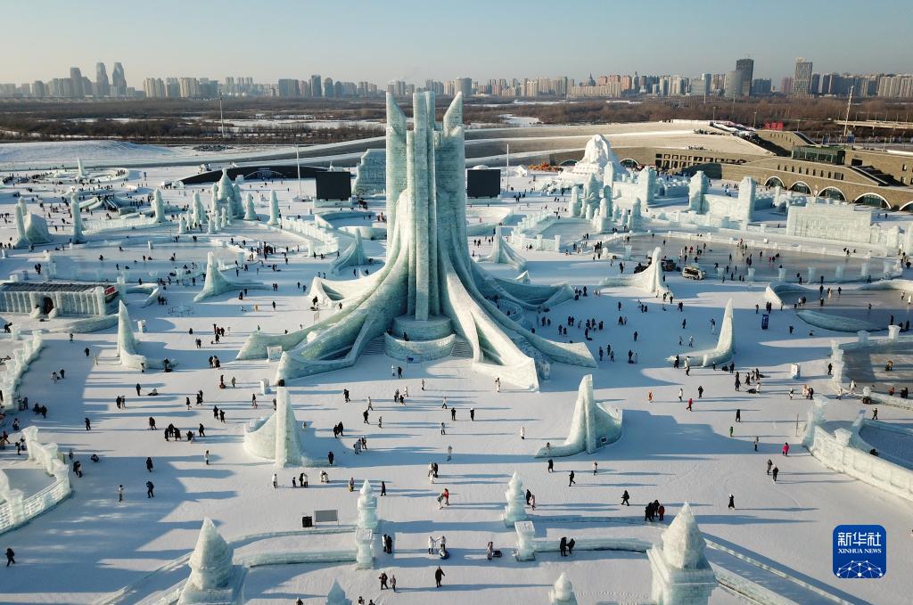 2月2日,游客在哈爾濱冰雪大世界園區內游玩(無(wú)人機照片)。