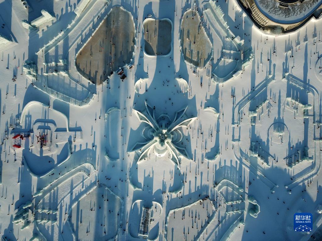 2月2日,游客在哈爾濱冰雪大世界園區內游玩(無(wú)人機照片)。