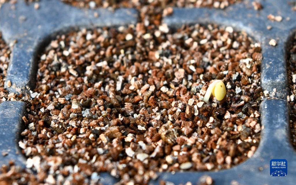這是2月2日在天津市農業(yè)科學(xué)院創(chuàng )新基地大棚內拍攝的一株剛剛破土發(fā)芽的花椰菜試驗種。