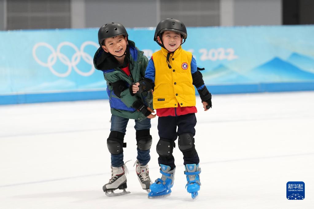 兩位小朋友在國家速滑館內滑冰(1月30日攝)。