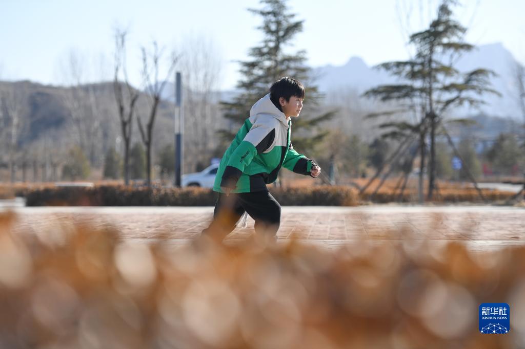 馬蘭花兒童聲合唱團團員顧站豪在河北省保定市阜平縣的一個(gè)廣場(chǎng)上滑輪滑(1月30日攝)。