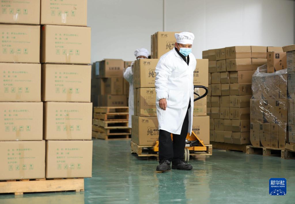 2月3日,在貴州玉屏侗族自治縣油茶基地的油茶加工企業(yè),工人在生產(chǎn)車(chē)間搬運茶油。