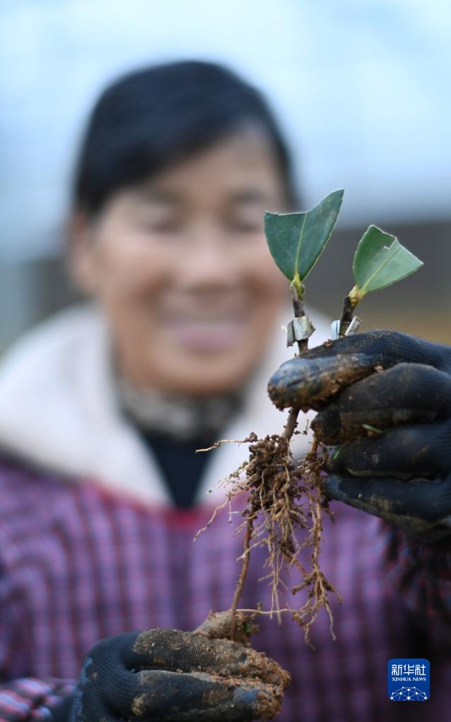 2月3日,工人在貴州玉屏侗族自治縣油茶基地的育苗中心展示扦插的油茶苗。