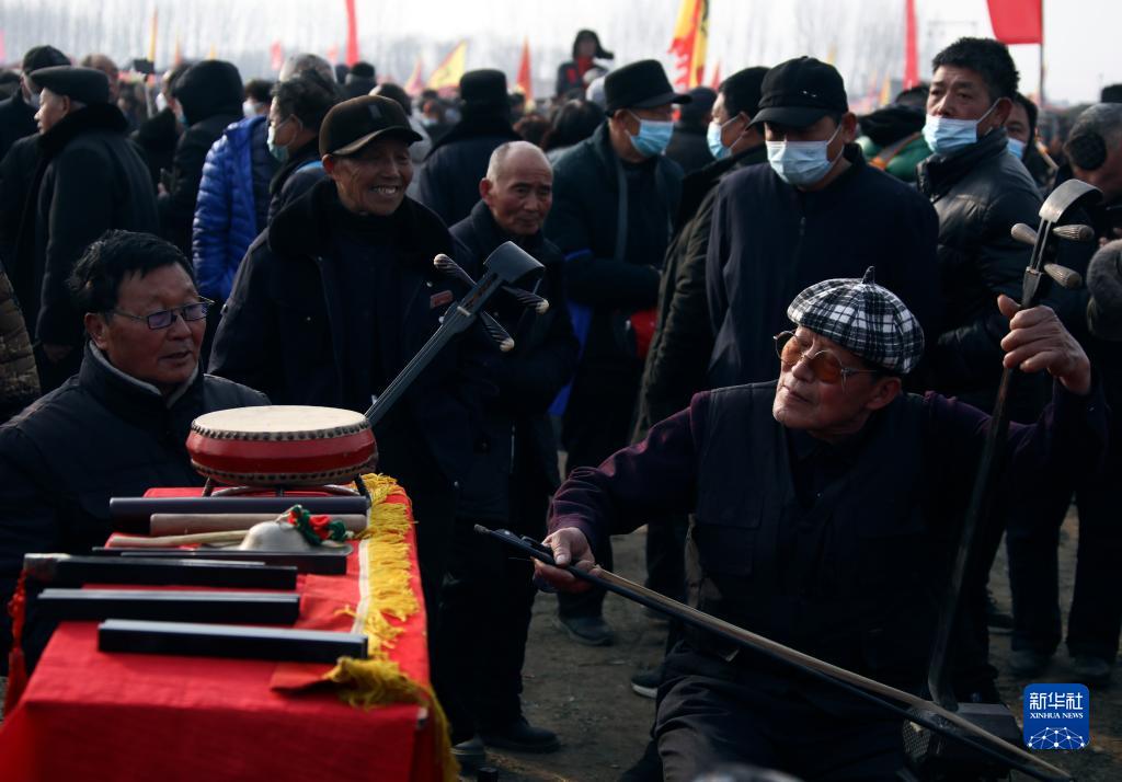 當日是正月十三,時(shí)隔三年,河南省寶豐縣馬街書(shū)會(huì )線(xiàn)下“重啟”。來(lái)自全國各地的說(shuō)書(shū)藝人負鼓攜琴,聚集于此。在麥田中,他們以天作幕,以地為臺,說(shuō)書(shū)會(huì )友,彈唱獻藝。