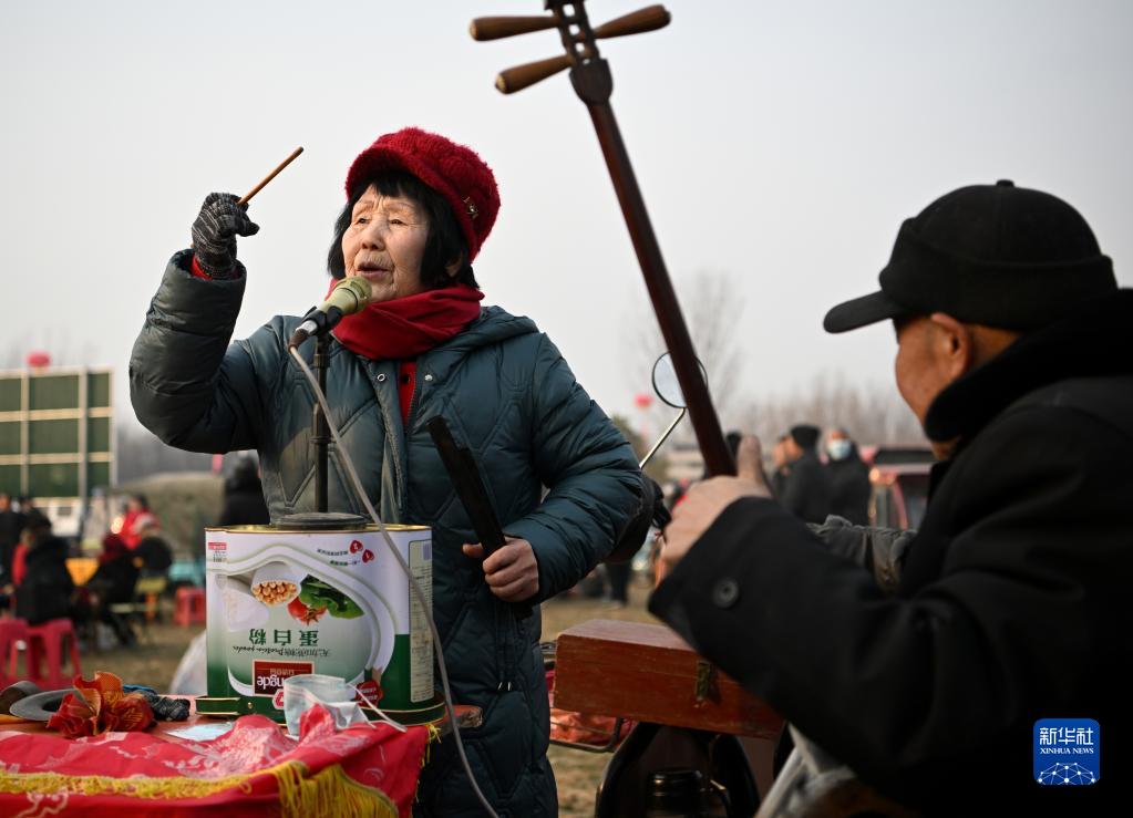 當日是正月十三,時(shí)隔三年,河南省寶豐縣馬街書(shū)會(huì )線(xiàn)下“重啟”。來(lái)自全國各地的說(shuō)書(shū)藝人負鼓攜琴,聚集于此。在麥田中,他們以天作幕,以地為臺,說(shuō)書(shū)會(huì )友,彈唱獻藝。