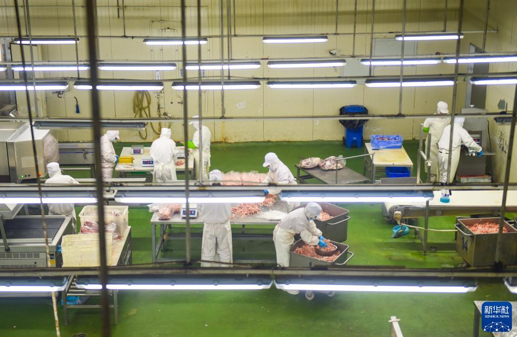 2月3日,在內蒙古赤峰市寧城縣一家肉牛產(chǎn)業(yè)有限公司的車(chē)間內,工人在分割生產(chǎn)線(xiàn)上作業(yè)。
