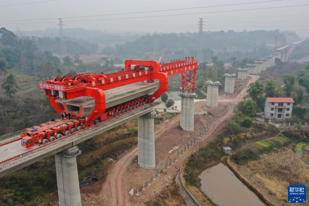當天,在由中鐵十一局集團承建的渝昆高鐵川渝段站前一標建設施工現場(chǎng),830噸大型箱梁在鴨子堡特大橋成功架設,標志著(zhù)渝昆高鐵重慶段實(shí)現節后全面復工復產(chǎn)。