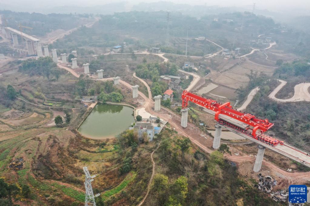 2月4日,在渝昆高鐵重慶段建設施工現場(chǎng),架橋機在進(jìn)行830噸大型箱梁架設作業(yè)(無(wú)人機照片)。