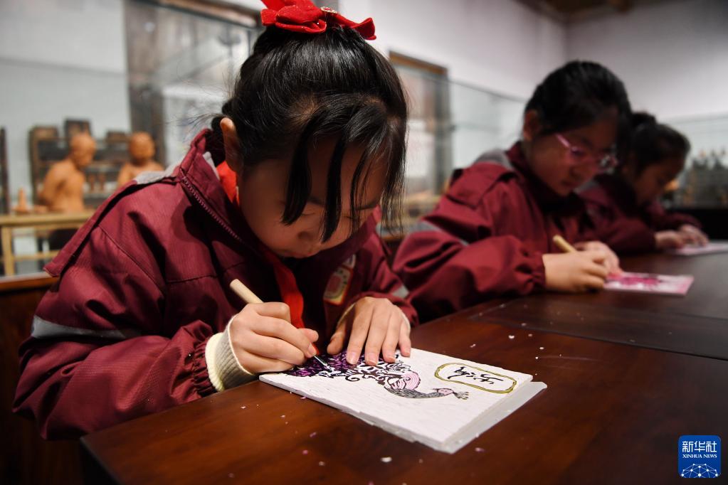 2月3日,小朋友們在武強年畫(huà)博物館練習制作木版年畫(huà)。