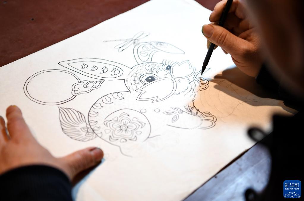 2月3日,武強木版年畫(huà)藝人在武強年畫(huà)博物館技藝展示區創(chuàng )作生肖兔主題年畫(huà)。