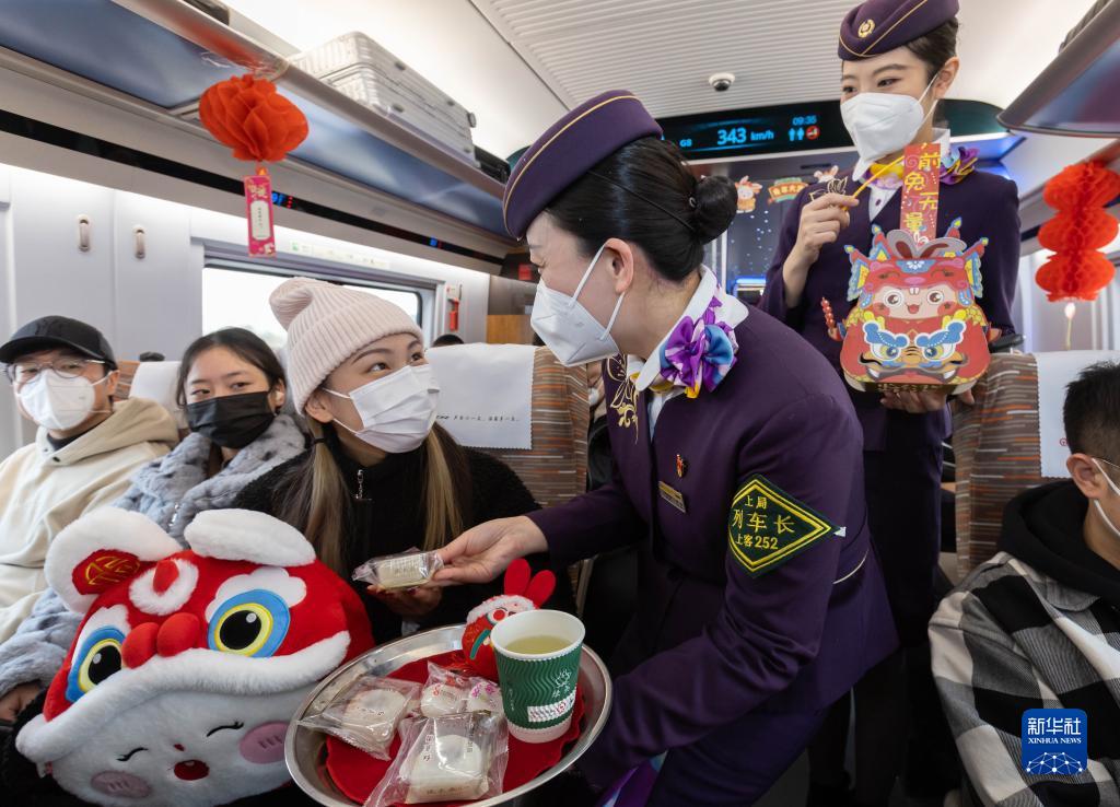 2月4日,鐵路上??瓦\段乘務(wù)人員在G8次列車(chē)上為旅客送上點(diǎn)心。