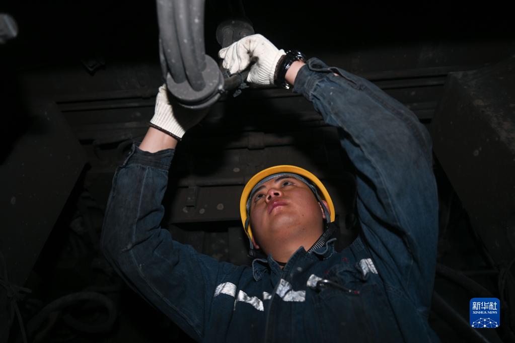 2月4日,在格爾木機務(wù)段檢修車(chē)間,馬國仁在檢修機車(chē)。