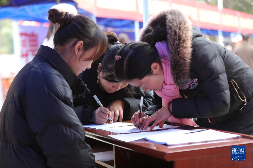 2月4日,在湖南張家界市武陵源區協(xié)合鄉舉行的“春風(fēng)送暖”農村用工招聘會(huì )上,村民填寫(xiě)崗位就業(yè)申請。當地20多家企業(yè)提供采茶工、廚師、講解員、酒店服務(wù)員等500多個(gè)就業(yè)崗位,幫助更多農村群眾實(shí)現家門(mén)口就業(yè)。
