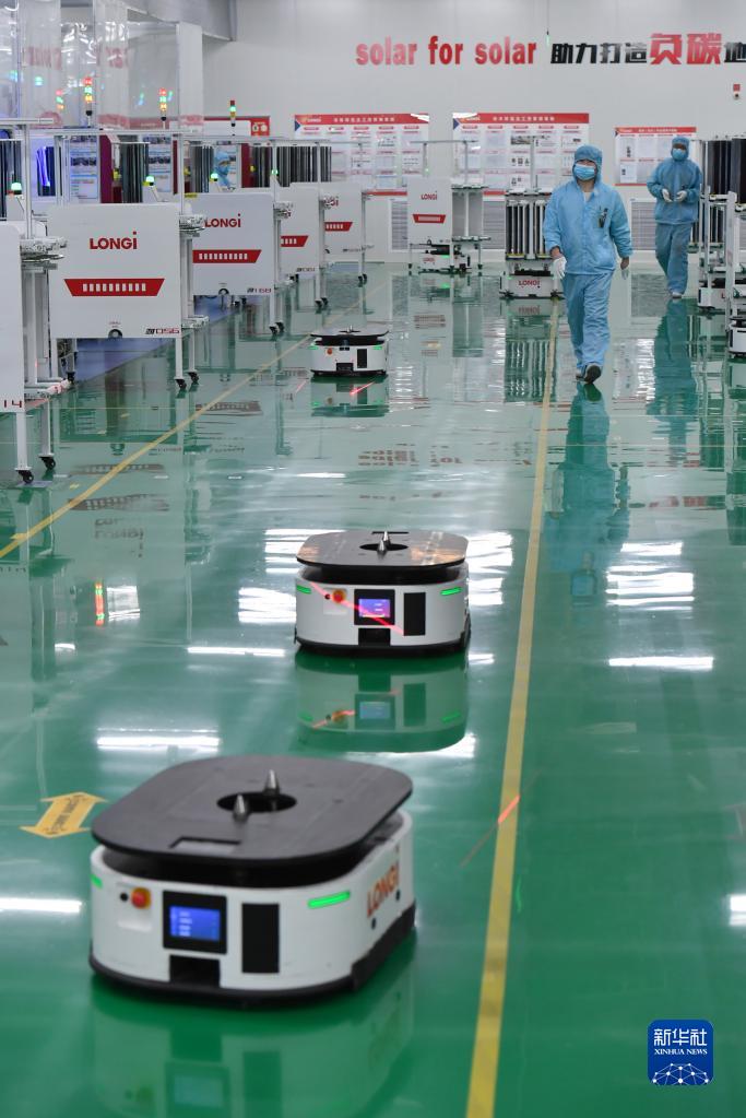 2月2日在隆基綠能高陵電池工廠(chǎng)內拍攝的智能搬運機器人。