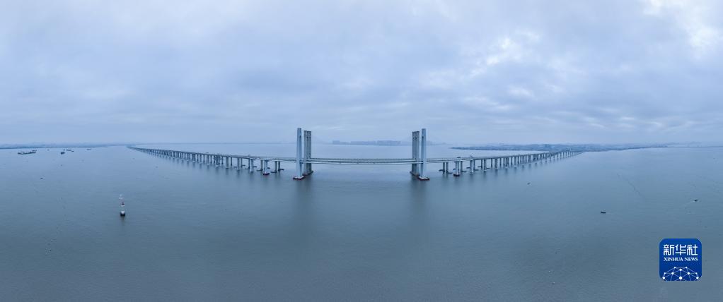 這是2月4日拍攝的福廈高鐵泉州灣跨海大橋(無(wú)人機合成照片)。