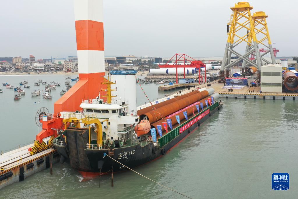 這是運往三峽集團福建漳浦六鰲海上風(fēng)電場(chǎng)二期項目點(diǎn)安裝的管樁(2月4日攝,無(wú)人機照片)。