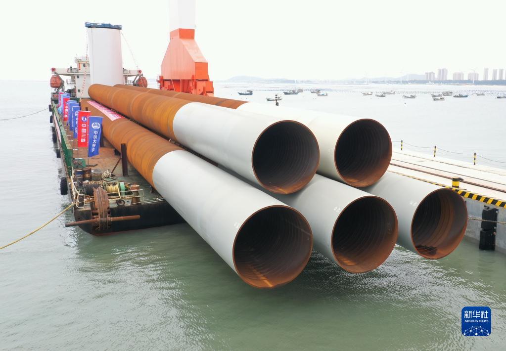 這是運往三峽集團福建漳浦六鰲海上風(fēng)電場(chǎng)二期項目點(diǎn)安裝的管樁(2月4日攝,無(wú)人機照片)。