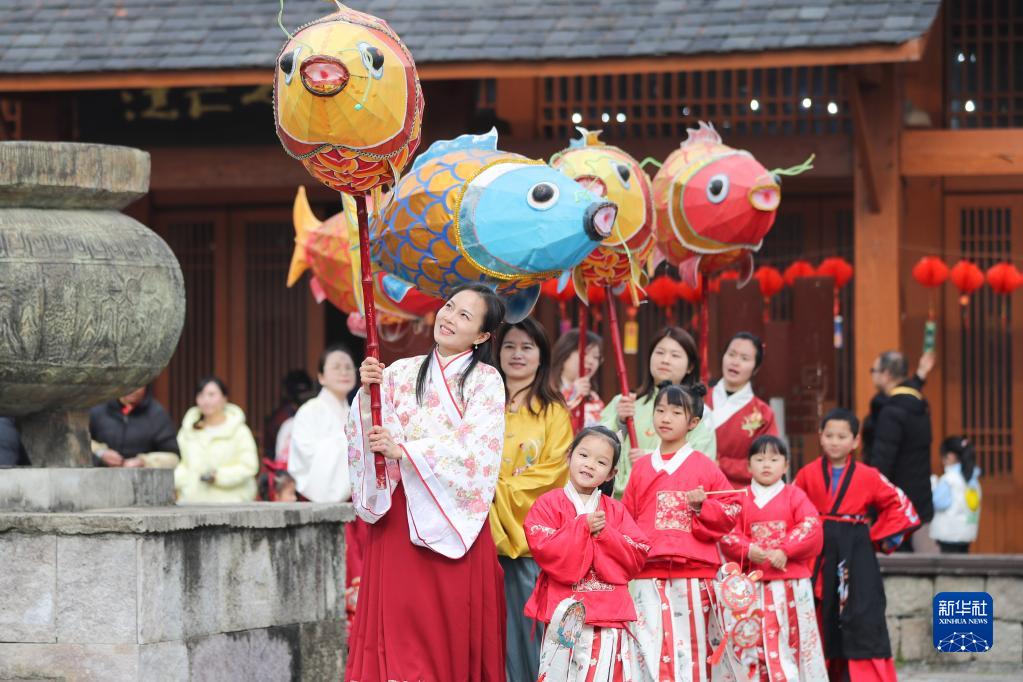 2月4日,在浙江省湖州市德清縣下渚湖街道二都村,村民在舞魚(yú)燈。