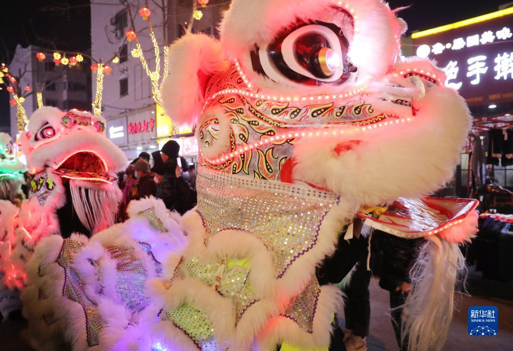 2月4日,民間藝人在山東青島西海岸新區長(cháng)江路街道濠洼夜市表演舞獅。