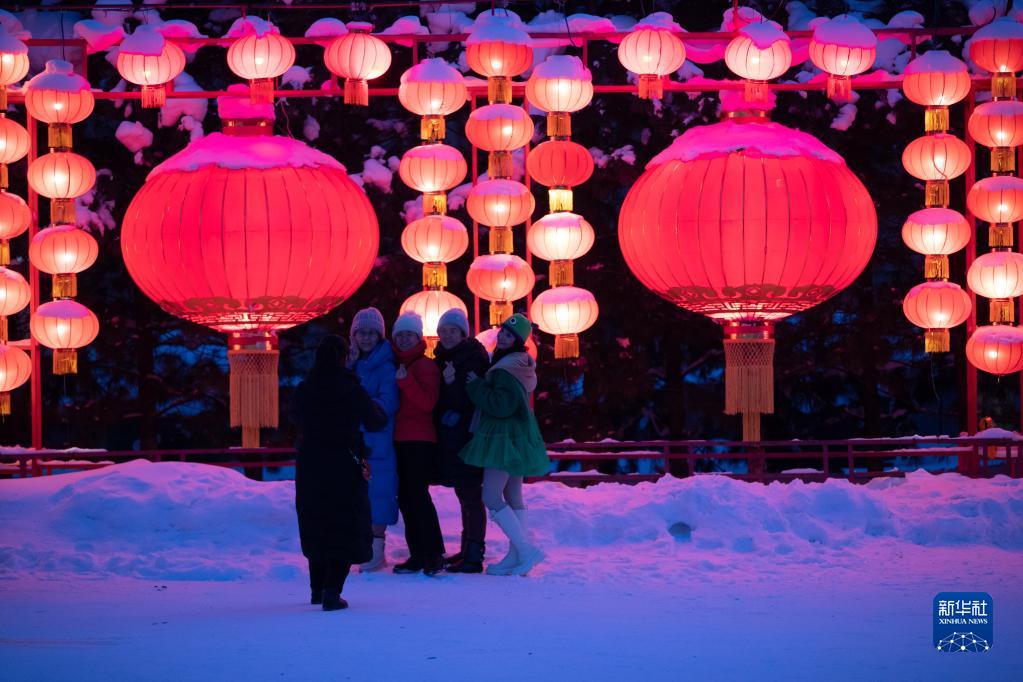 2月4日,游客在位于黑龍江省牡丹江市的大海林林業(yè)局有限公司雙峰林場(chǎng)雪鄉景區內拍照留念。