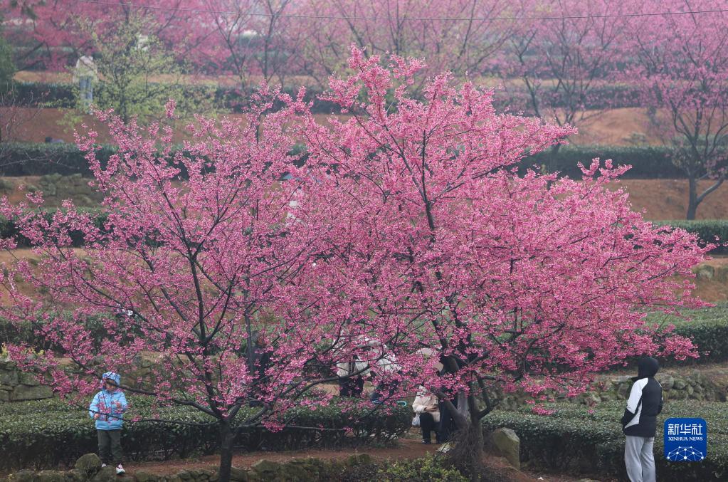 立春時(shí)節,福建省廈門(mén)市翔安區妙高山種植的櫻花在生態(tài)茶園里競相綻放,美不勝收。