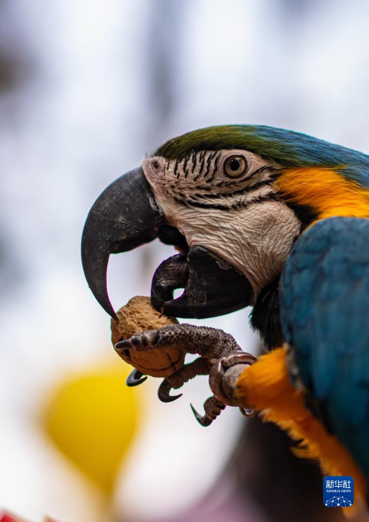 2月4日,云南野生動(dòng)物園的金剛鸚鵡品嘗堅果。