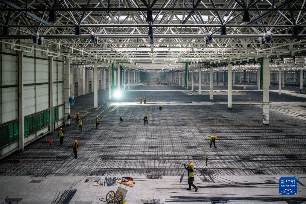 工作人員在奧迪一汽新能源汽車(chē)項目建設現場(chǎng)進(jìn)行施工作業(yè)(1月31日攝)。