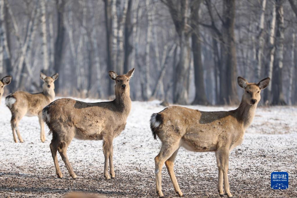 2月4日,一群梅花鹿在中國龍江森林工業(yè)集團有限公司平山皇家鹿苑內覓食。