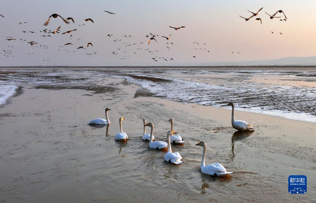 近日,黃河西岸的合陽(yáng)黃河濕地自然保護區內,天鵝今年首次規模出現,數量近千只。