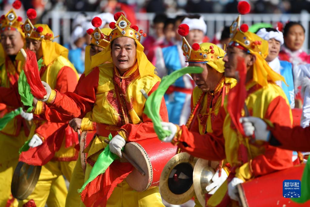 2月5日,在甘肅省白銀市舉辦的社火展演上,民間社火隊的演員在表演。