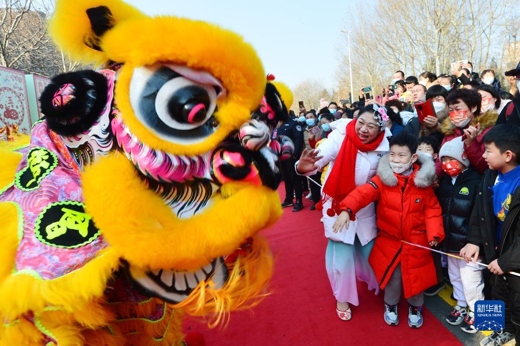 2月5日,在山東省青島市城陽(yáng)區第二十八屆“民間藝術(shù)節”鬧元宵展演活動(dòng)上,來(lái)自紅島街道的舞獅吸引市民圍觀(guān)。