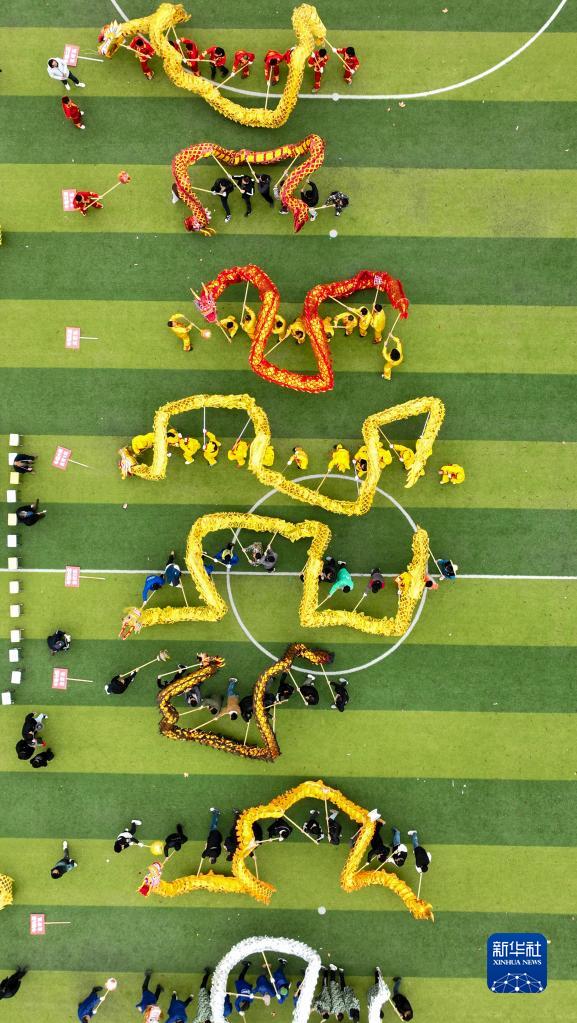 2月5日,村民們在貴州省遵義市湄潭縣黃家壩街道表演舞龍(無(wú)人機照片)。