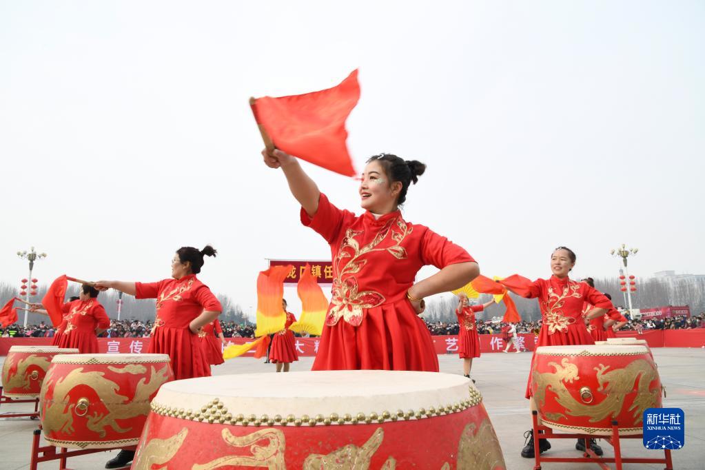 2月5日,民間藝人在河南省濟源市文化城西廣場(chǎng)表演鼓舞。