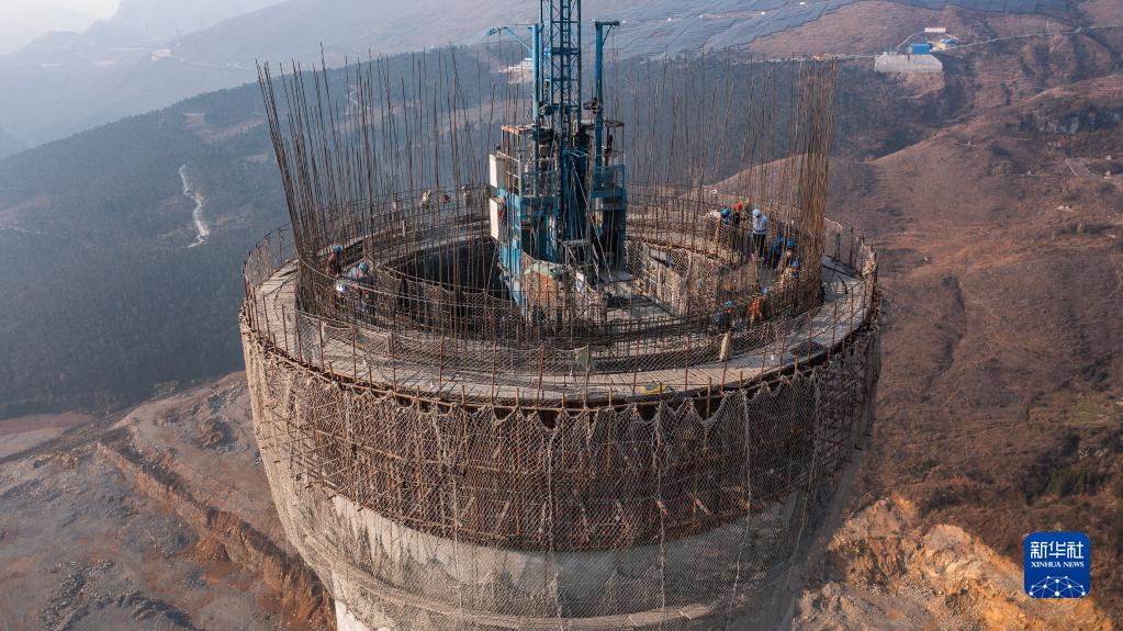 工人在盤(pán)江新光燃煤發(fā)電項目鍋爐尾氣排放煙囪上施工(2月1日攝,無(wú)人機照片)。