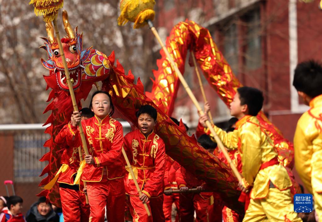 2月5日,在合肥市蚌埠路第二小學(xué),孩子們表演舞龍。