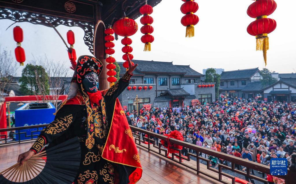 2月5日,在四川省瀘州市江陽(yáng)區分水嶺鎮傘里古街,民間藝人在表演川劇“變臉”。