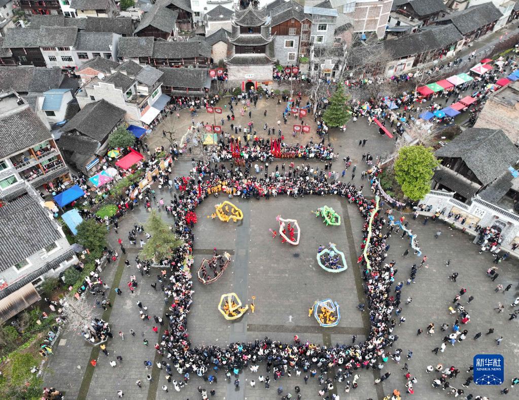 2月5日,人們在貴州省錦屏縣隆里古城觀(guān)看“花臉龍”表演(無(wú)人機照片)。