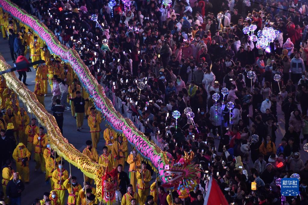 2月5日,游客在湖南省郴州市宜章縣一六鎮觀(guān)看舞龍表演。