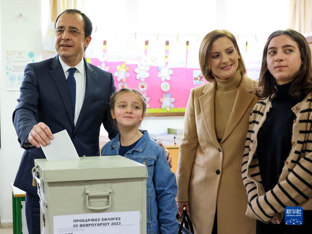 2月5日,獨立候選人、前外長(cháng)赫里斯托祖利季斯(左)在塞浦路斯帕福斯的一個(gè)投票站投票。