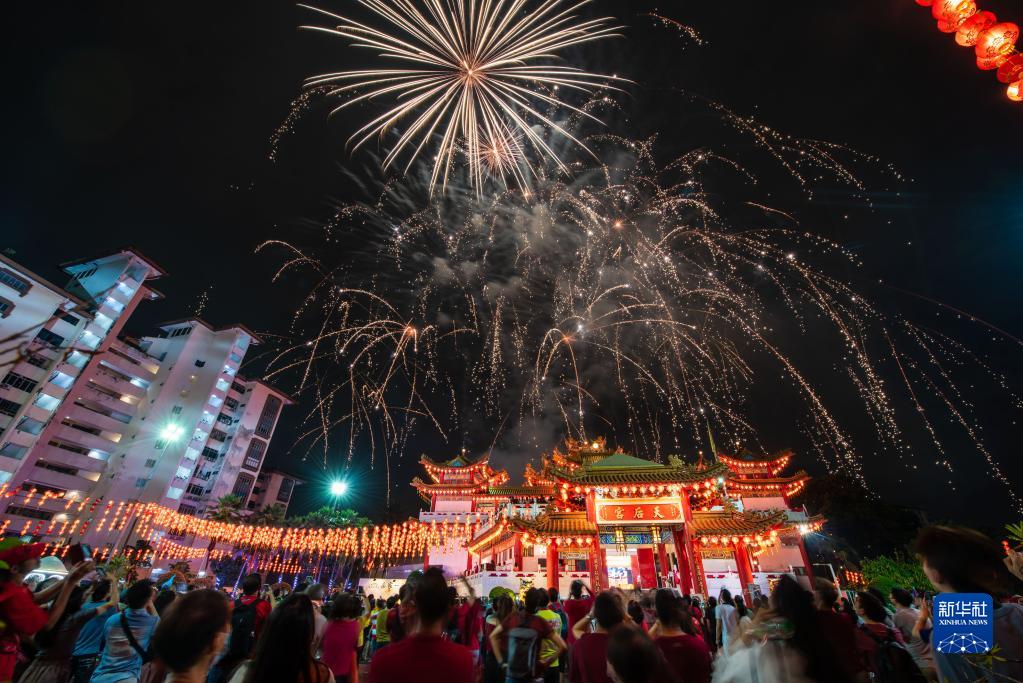 2月5日,民眾在馬來(lái)西亞吉隆坡天后宮觀(guān)賞煙花。