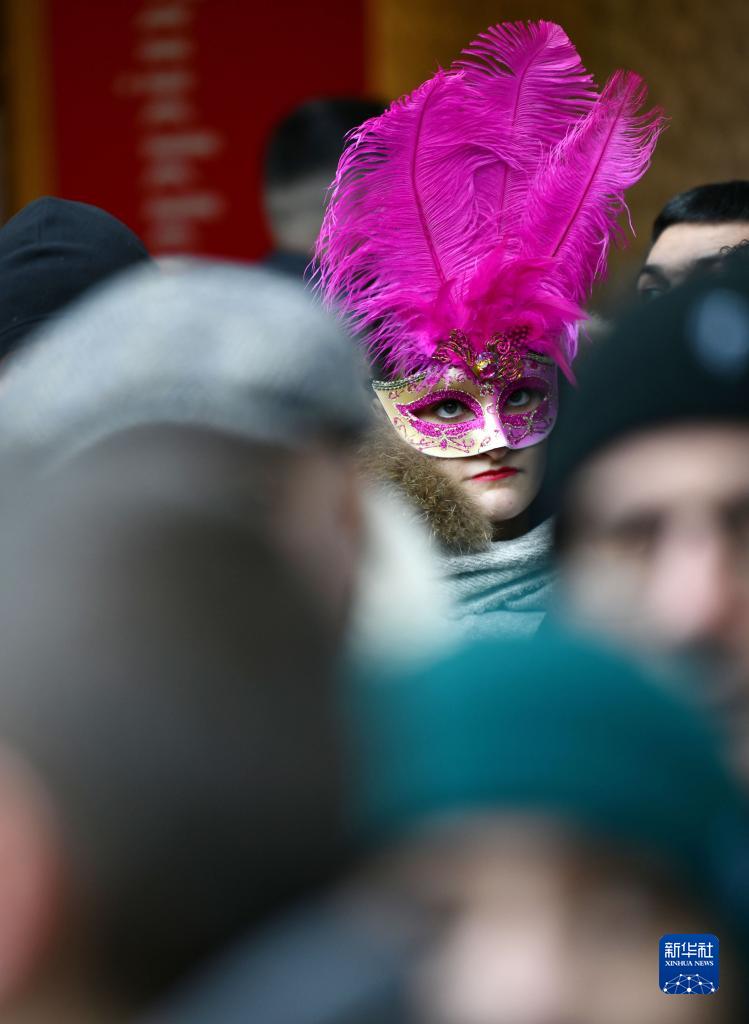 2月5日,一名女子戴上面具在意大利威尼斯參加狂歡節。