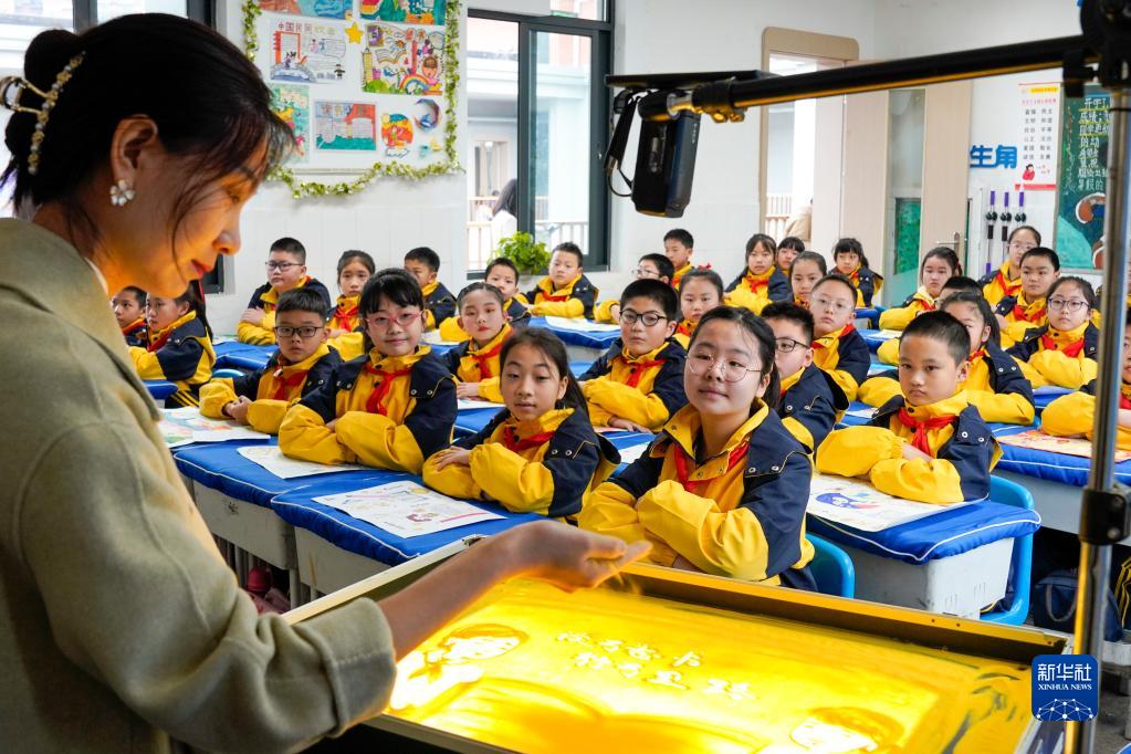 2月6日,在重慶市九龍坡區鐵路小學(xué)五年級2班的開(kāi)學(xué)第一課上,外援老師用沙畫(huà)展示學(xué)生們閱讀的書(shū)籍內容。學(xué)校希望通過(guò)開(kāi)展“美學(xué)秀”開(kāi)學(xué)第一課引導學(xué)生發(fā)現生活之美和閱讀的樂(lè )趣。